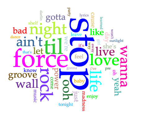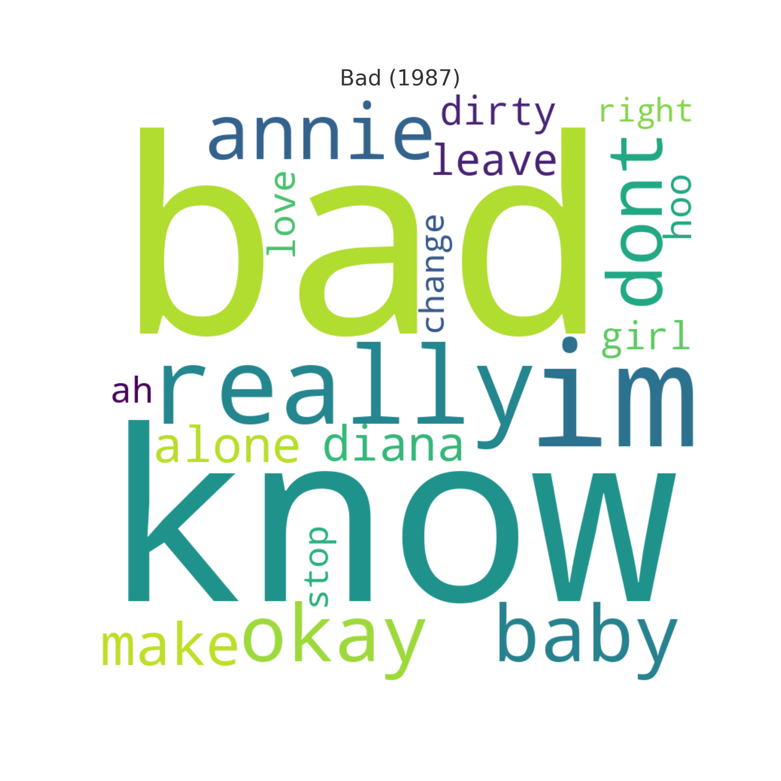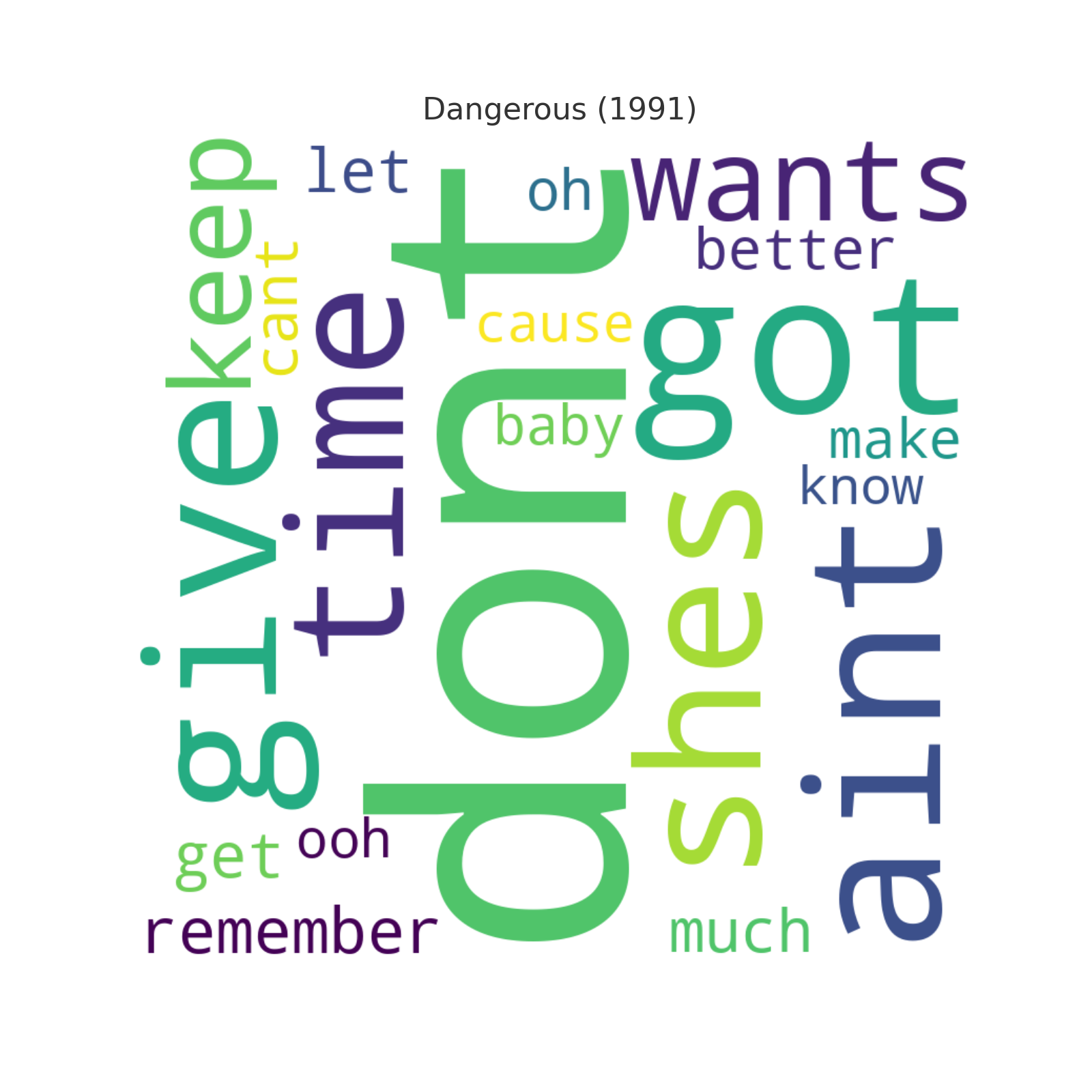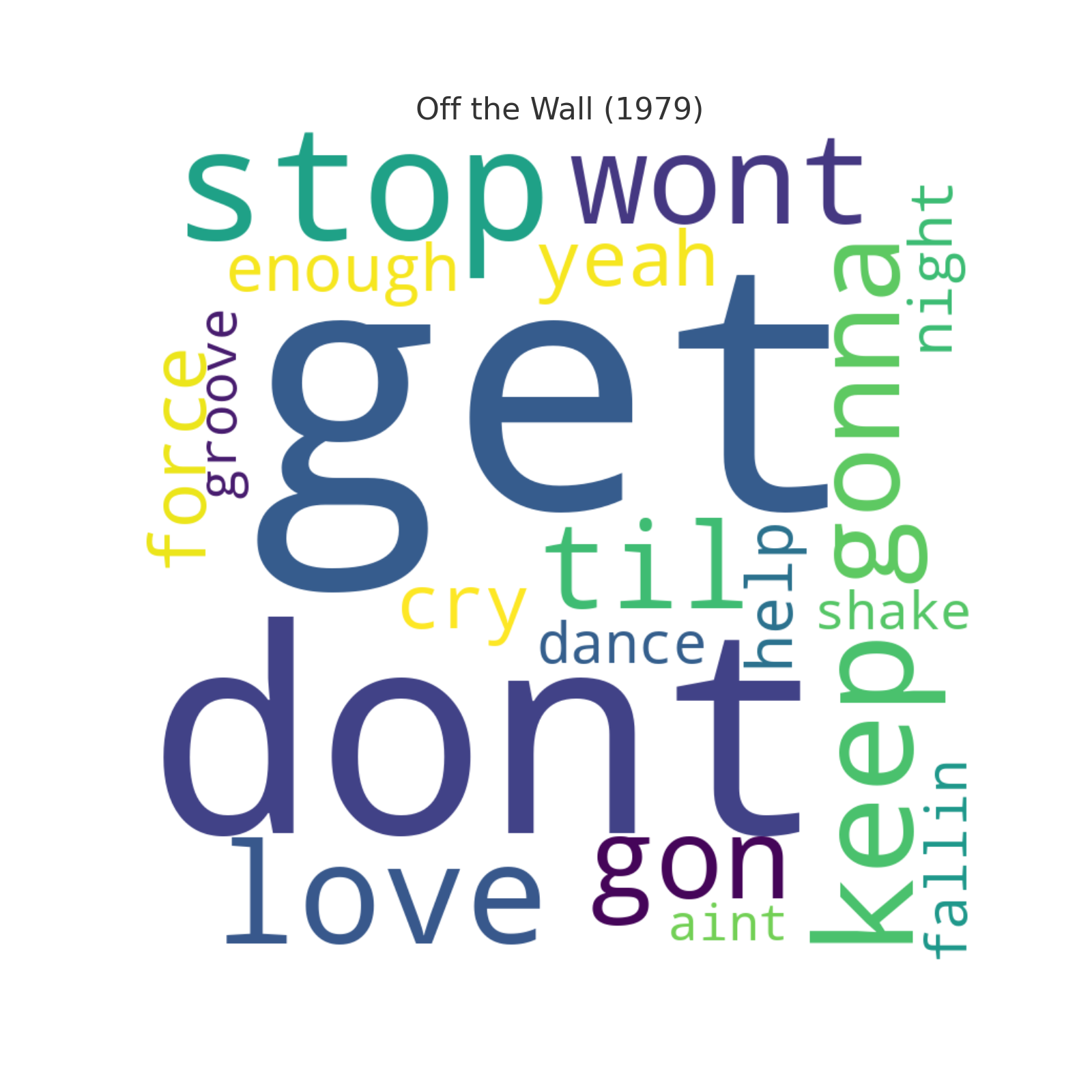 Words like "dance," "night," and "get" evoke a vibrant, energetic atmosphere, resonating with the disco era's exuberance. The emphasis on movement and rhythm in this word cloud captures Michael's evolution into a more sophisticated and versatile artist.
