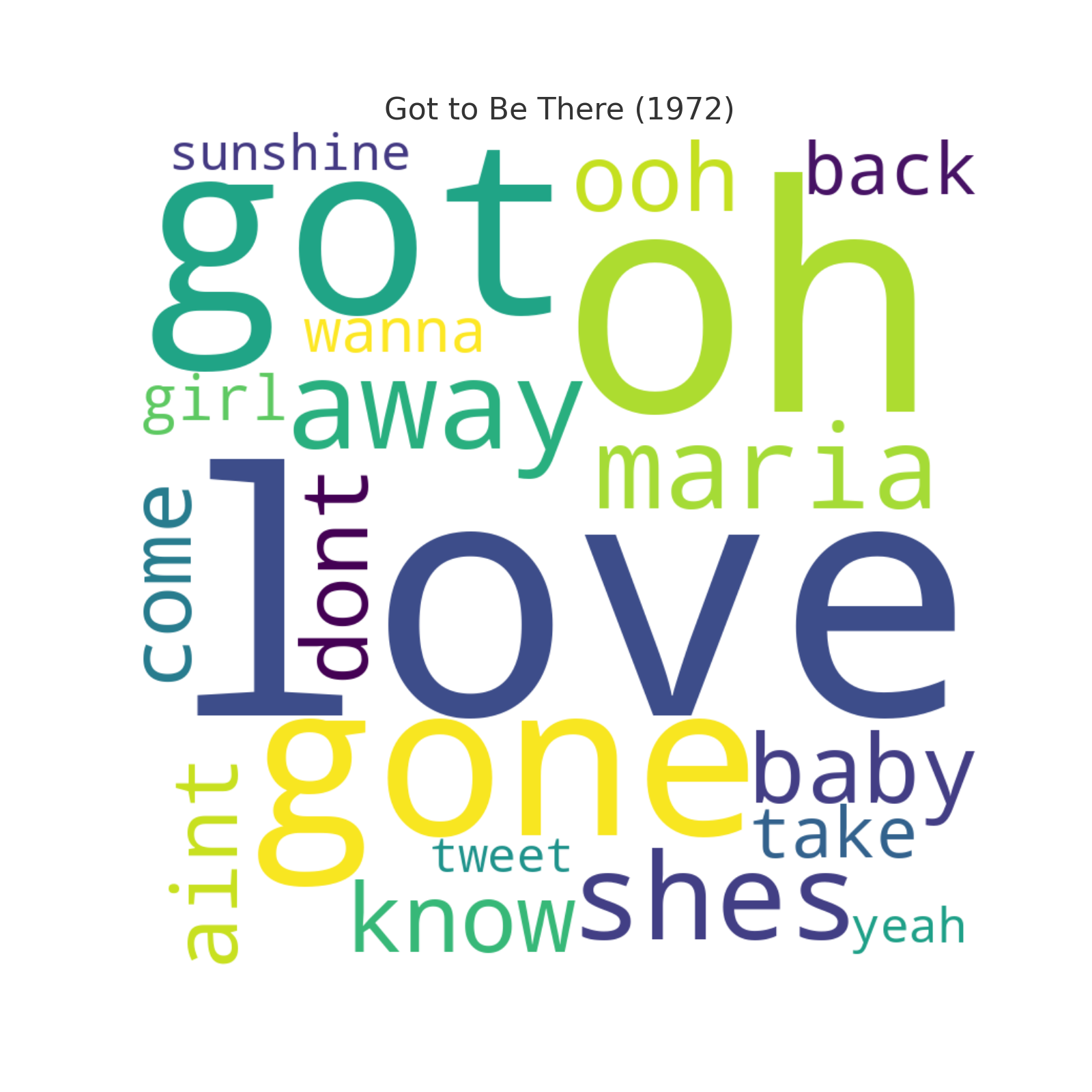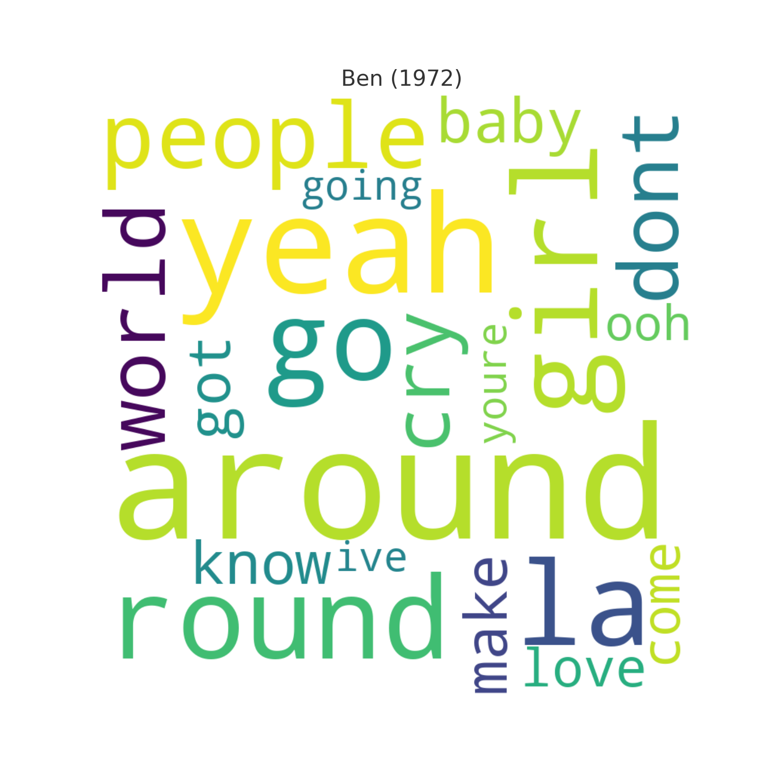 With this word cloud, "ben" the name of the main song, is also the most repeated word. Additionally, there are no interjected phrases in this album's famous songs. Here, the most prominent word is "friend," reflecting the title track "Ben," which is a song about friendship. The words "say," "feel," and "you're" imply a personal and emotional connection, which aligns with the sentimental and gentle nature of the album's songs.