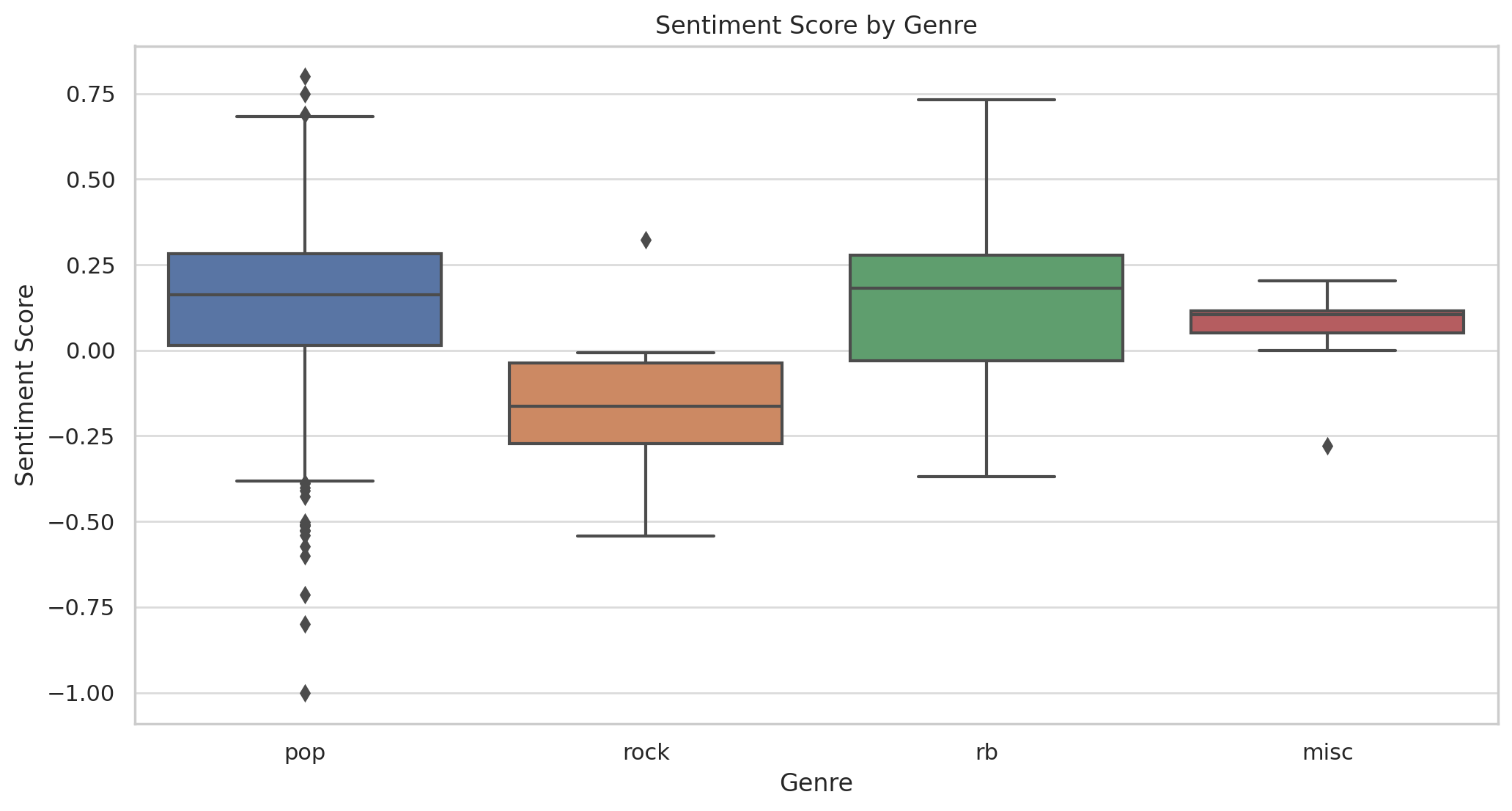 - Genre Analysis:When examining sentiment scores by genre, it seems that different genres have varied sentiment profiles. However, due to the overlapping ranges, it's hard to conclude a strong distinction between genres based solely on sentiment scores.The subjectivity scores by genre also show variation, but again, there's significant overlap, suggesting that lyrical subjectivity is not strongly tied to a specific genre.