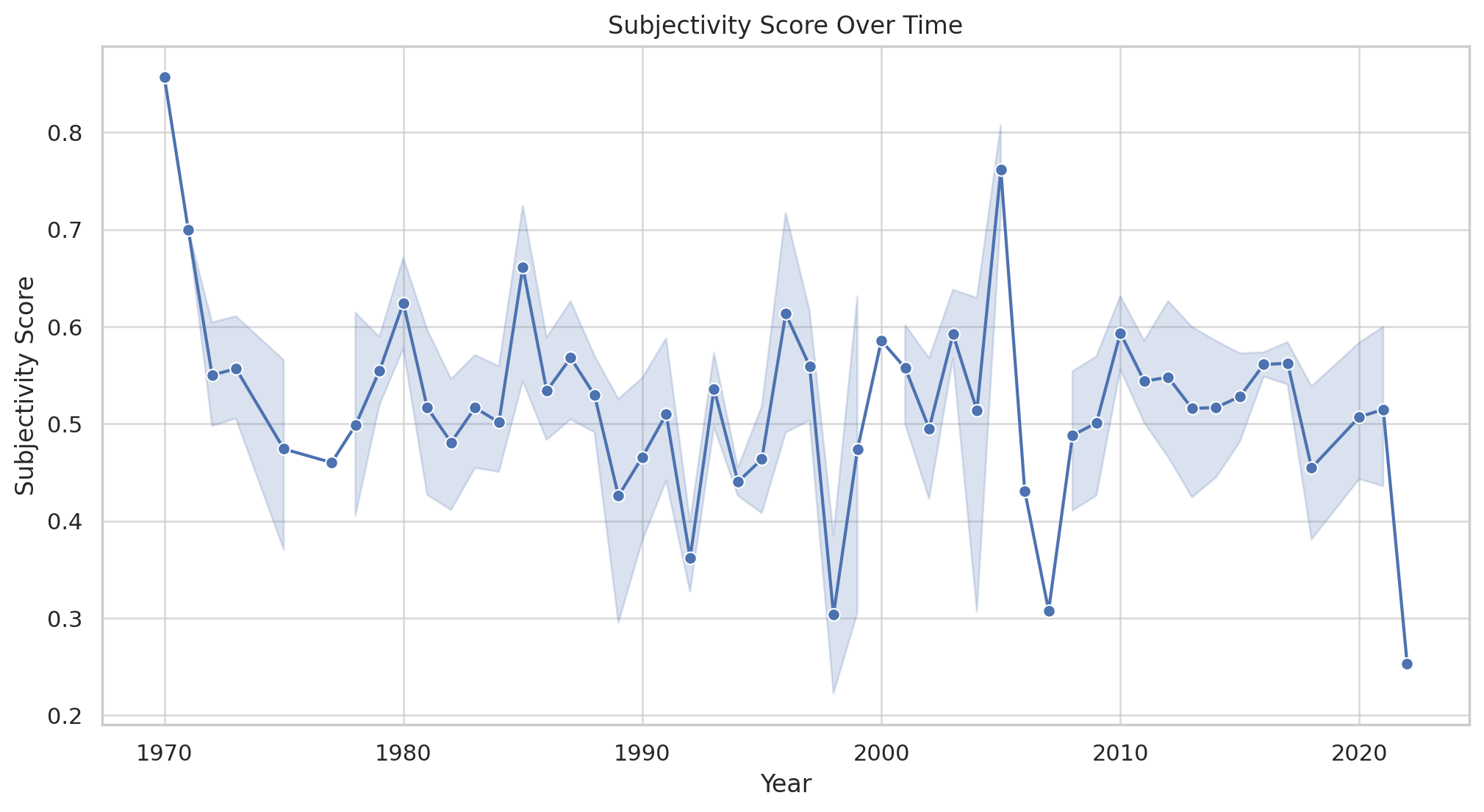 - Subjectivity Over Time:Similar to sentiment, the subjectivity scores also fluctuate over time. This indicates varying levels of subjectivity in the lyrics, without a clear trend towards more or less subjective content over the years.