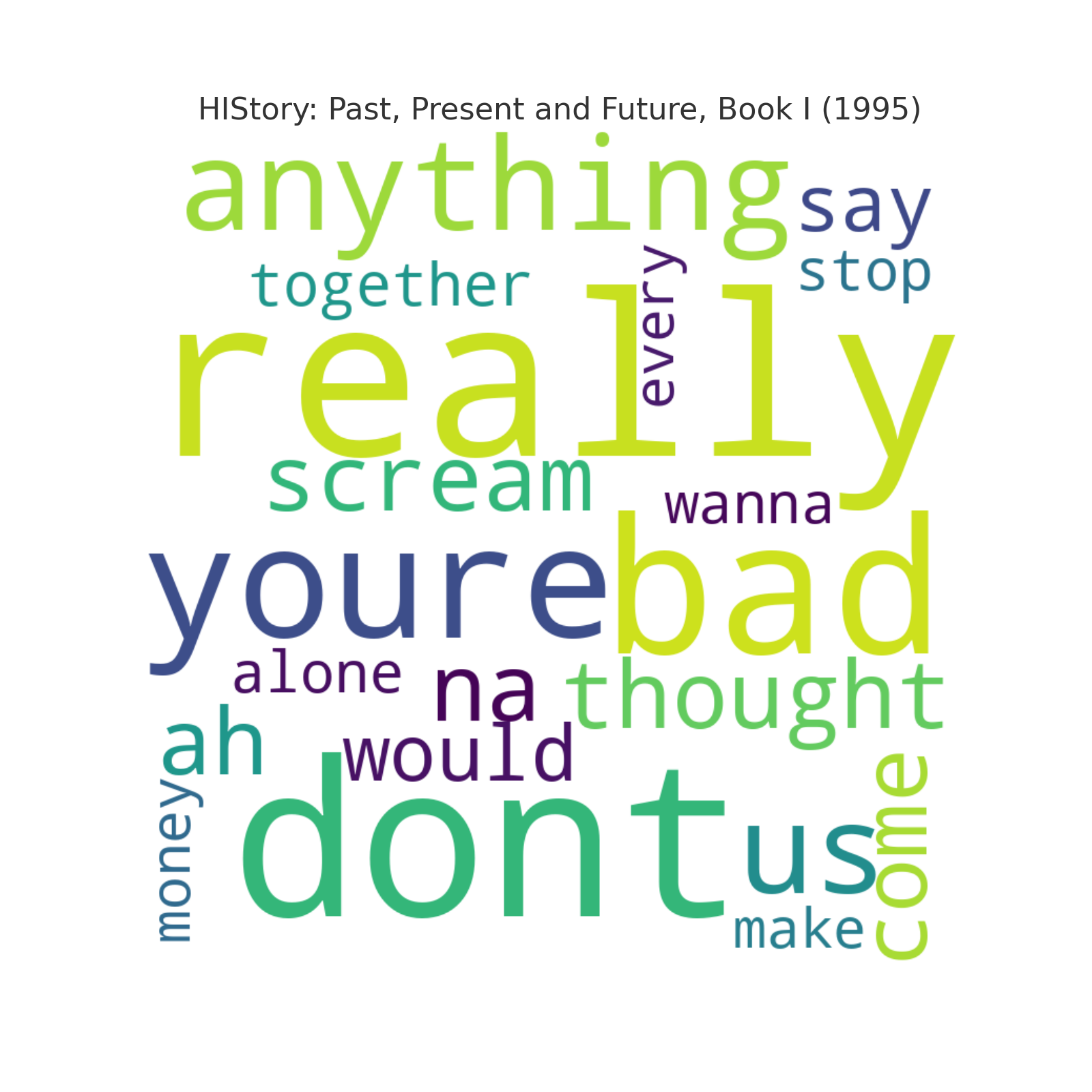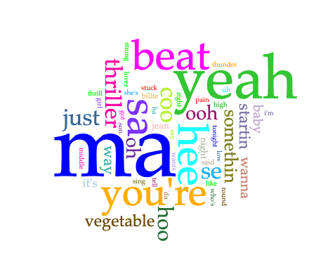 This word cloud not only serves as a textual representation of Michael Jackson's lyrical themes but also as a visual representation of the language that defined his presence in the music industry, particularly in the context of his commercial success as reflected by the Billboard charts. Jackson's trademarked slogan, "hee hee," shows up in the top 5 words, indicating how much he uses this sloagn throughout his songs as well.