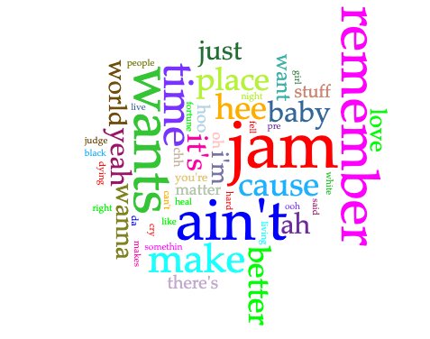 In this cloud, "world," "jam," "ain't," and "love" stand out. "Jam" likely refers to the song of the same name, which has a strong message about coming together to make the world better. "World" and "love" reflect the album's broader themes of global harmony and personal relationships, while the informal contraction "ain't" points to the conversational and sometimes confrontational tone present in the lyrics.