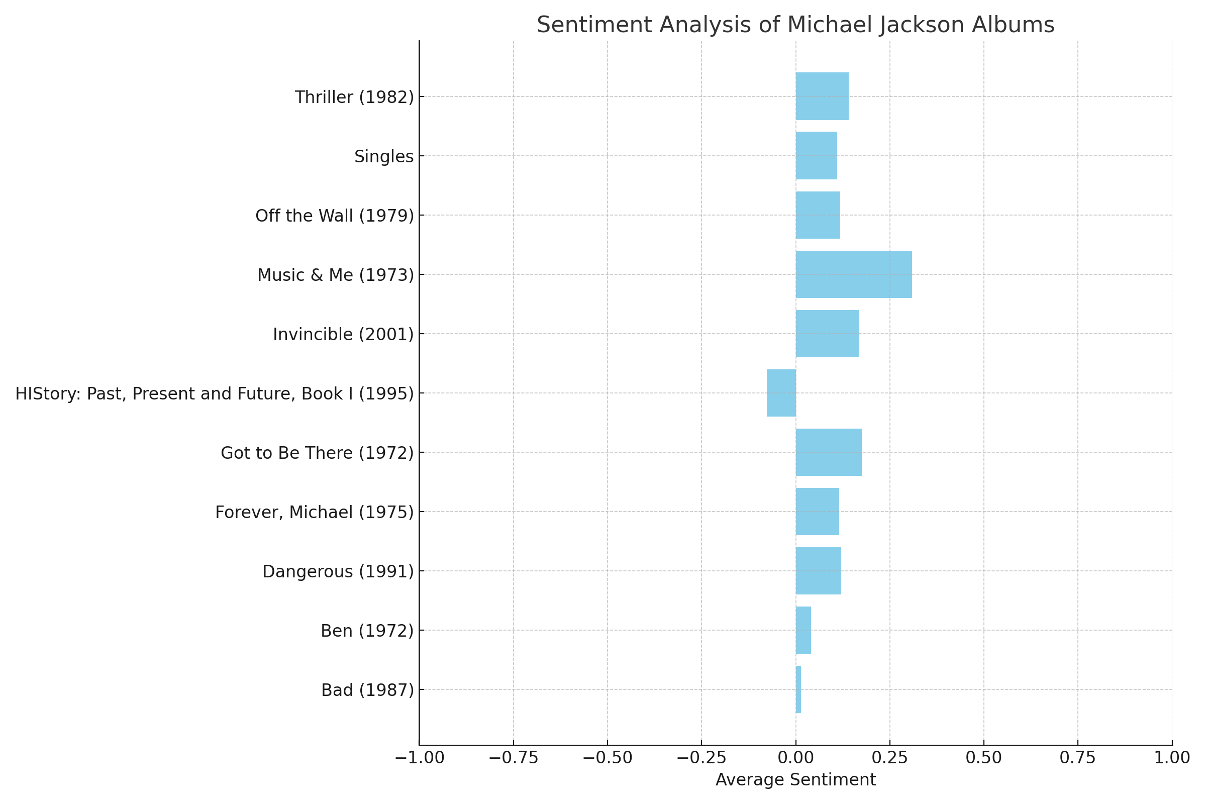 The sentiment analysis graph shows a range of emotional expressions throughout Jackson's discography. "Thriller" and "Off the Wall" exhibit positive sentiment, likely reflecting the upbeat and lively nature of these iconic albums. "HIStory" and "Invincible" present a more neutral to positive sentiment, which might correspond to a mix of socially conscious lyrics and personal themes. Notably, "Bad" shows a negative sentiment, possibly indicating darker or more introspective themes within the album, contrasting with the confident and assertive public persona that the album title might suggest.