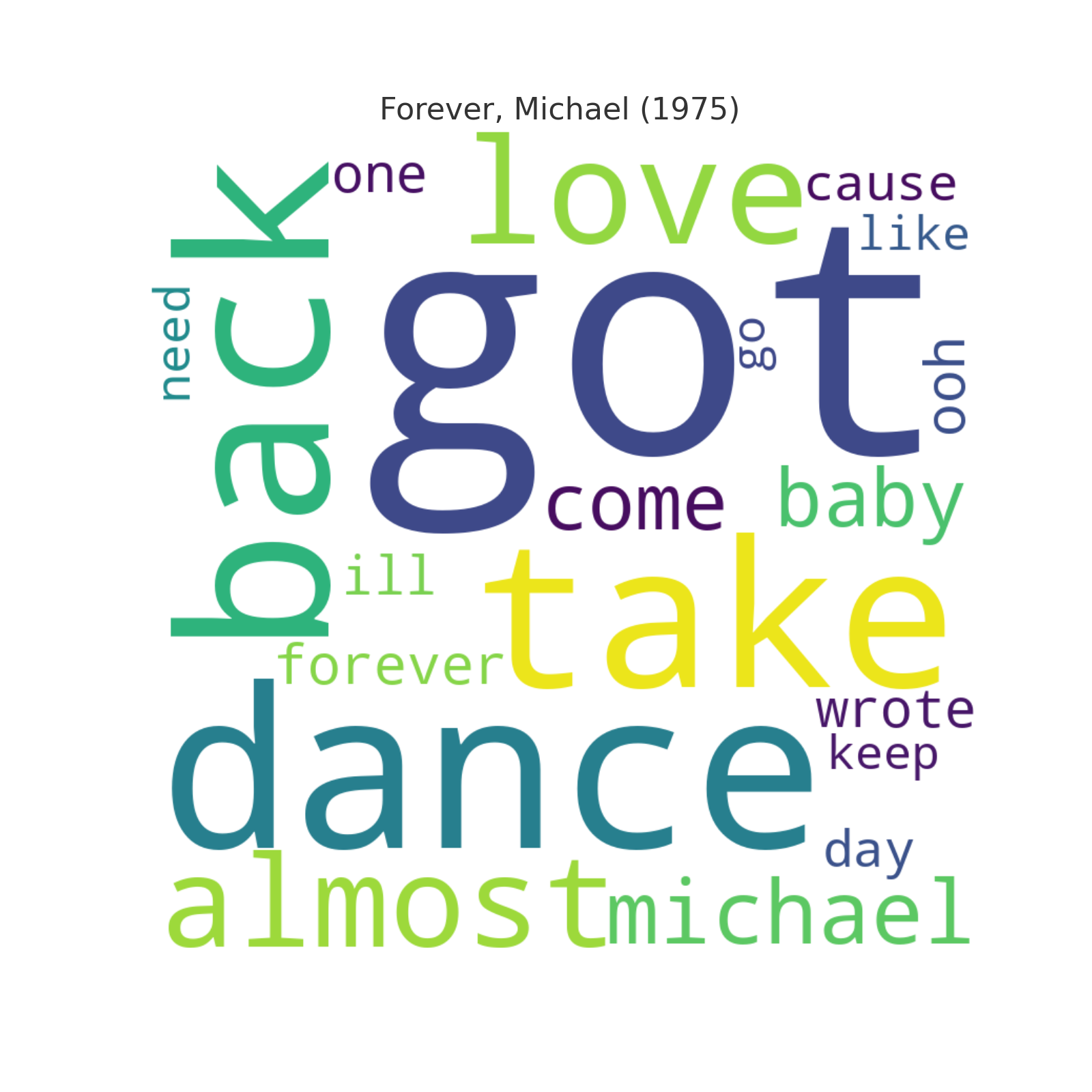 "Music and Me" continues this trend, with "child," "heart," "easy," and "gonna" evoking a nostalgic embrace of childhood innocence and a soothing, melodious approach to life's narratives. "Forever, Michael" introduces a sense of retrospection and romantic maturation, with "love," "we're," "just," and "remember" suggesting a nuanced reflection on past experiences and relationships.