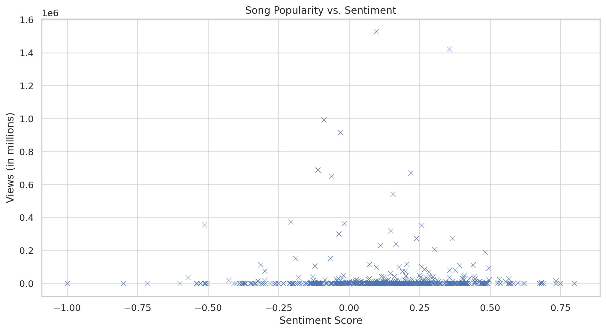 - Popularity vs. Sentiment: Examine the relationship between the sentiment scores and the song's popularity (views) to see if there is a correlation.