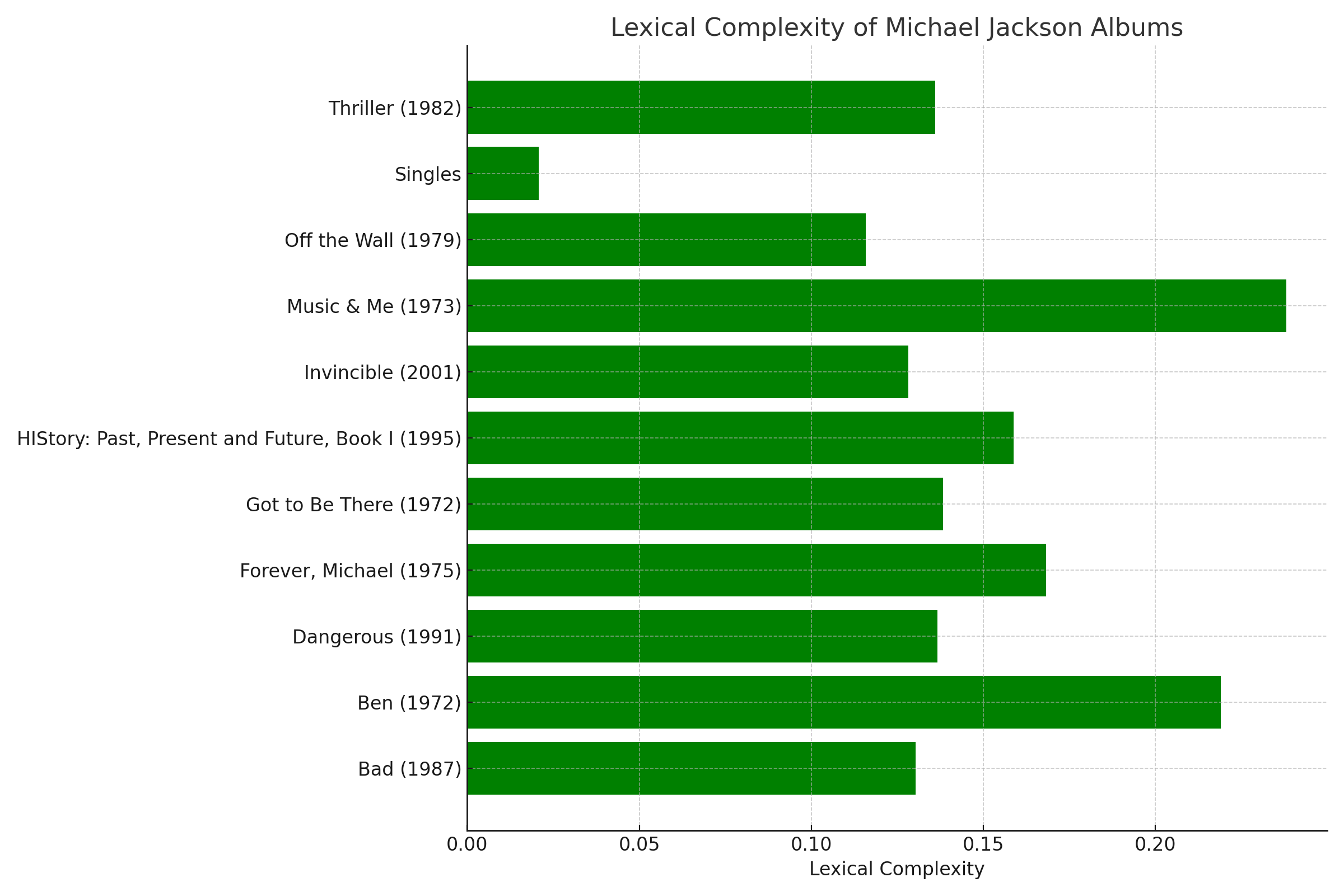 The lexical complexity analysis underscores this evolution, with "Thriller" showing the highest diversity in vocabulary, indicating a creative zenith in Jackson's career. In contrast, other albums display a more focused lyrical approach with lower complexity, suggesting a concentration on central themes and motifs.